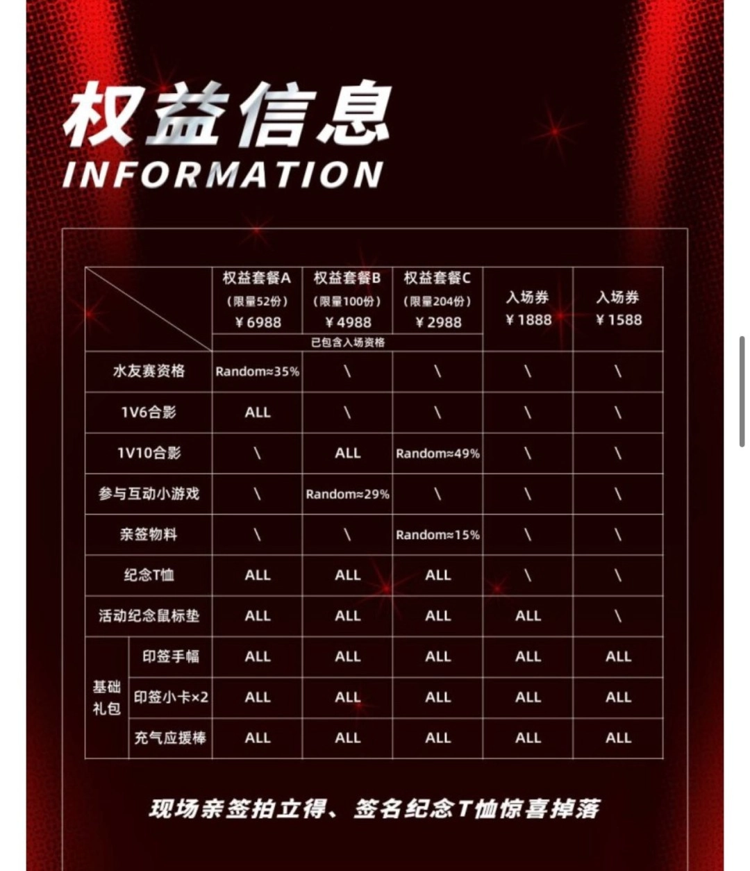权益套餐票:分为2988元、4988元及6988元三档,预计包含专属纪念品、互动机会等附加权益。