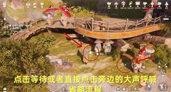 4、跟随任务指引前往光点位置,选择等待【中午的菇想会】开始,可反复点击等待按钮推进时间,也可使用旁边的“呼喊”选项加快流程