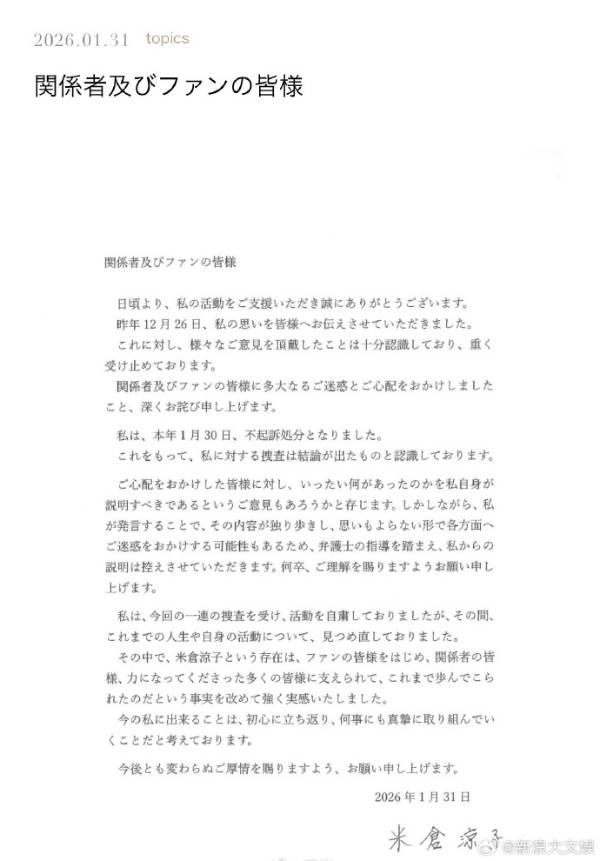 针对不起诉结果,米仓凉子回应称:希望大家依然能像从前一样给予我不变的关爱