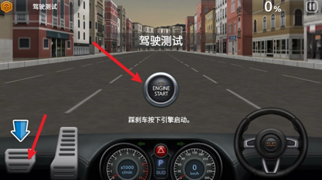 正式开始驾驶后,点击左侧的短踏板,接着按下中间的引擎按钮来启动汽车。
