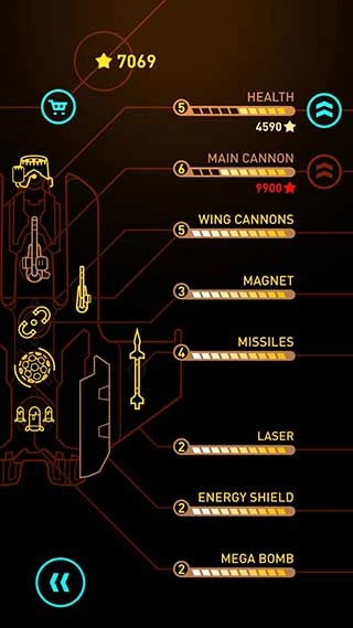 首先推荐升级武器,个人建议优先点翼炮——它的过量伤害能穿透目标,对付小飞机时可以实现一打多的效果;其次是导弹,别看初始只有两枚,实际伤害相当可观,尤其是解锁最后那个导弹分裂的飞机后,导弹数量能飙升到16枚,补刀能力直接拉满。至于激光、护盾和核弹,建议往后放一放,因为提升幅度不算大,我通常都是最后才升级这几项;要是对自己的操作技术有信心,血量也可以留到最后升,毕竟每关都有无伤通关的目标可以争取。