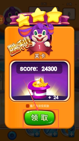 领取奖励:在关卡score24300+24界面点击双倍奖励领取后进入下一关。