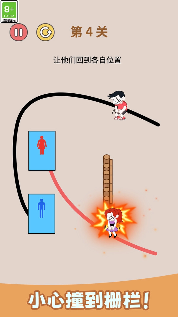 《趣味画线大闯关》是一款充满趣味的益智划线小游戏!帮助着急找厕所的角色规划安全路线,用手指随手一画,人物就会沿着线条移动,目标是顺利抵达终点。途中需要灵活躲避各类固定障碍和往来人群,稍有不慎就可能失败。游戏拥有超多不同主题的地图,障碍设计千变万化,操作简单易上手但极具挑战性,能让你在几分钟内收获满满的脑力乐趣,还特别解压。规划好最优路线后,就让角色快速冲向厕所吧!