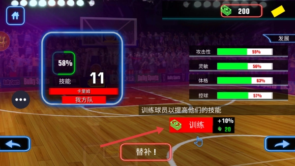 点击训练需消耗20货币,可提升10%属性,强化球员技能、灵敏感知等方面,凭借数值优势压制对手。