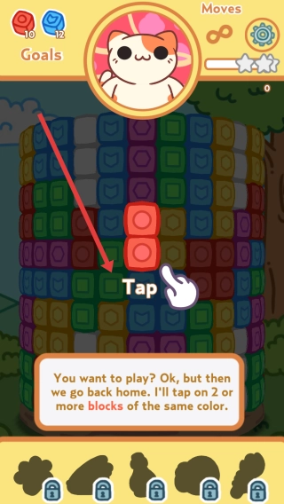 进入游戏界面后,按照提示操作:点击2个或以上颜色相同的方块即可触发消除效果,现在开启Level-1的挑战吧。
