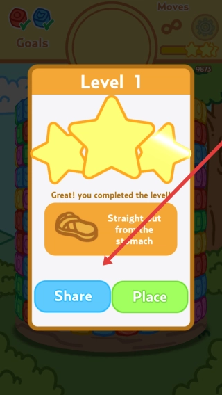 完成Level-1后,在结算界面可根据箭头提示,选择Share分享或Place放置奖励,以继续挑战后续关卡。