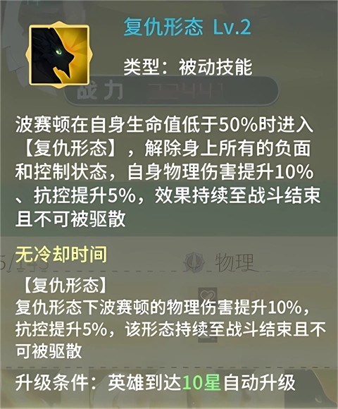 在[复仇形态]下,波赛顿的物理伤害会提升15%,抗控能力也会增加10%;此形态一旦触发便会持续到战斗结束,并且无法被驱散。