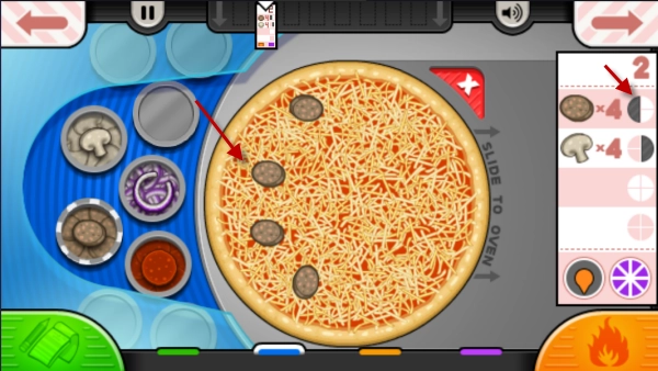 第一步需为饼胚铺设规定的辅料,要留意观察后方的黑色区域,这表示对应的辅料应放置在该位置。