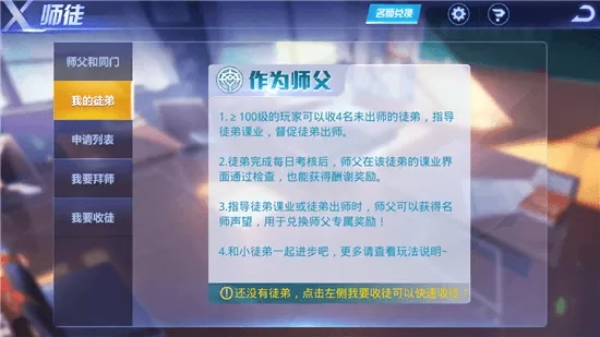 当然啦,师傅这个角色可没那么容易担当,只有等级达到100级以上的玩家才有资格胜任。一旦玩家符合当师傅的条件,最多能同时收下4位还没出师的徒弟。