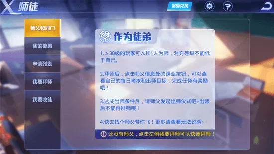当玩家等级达到30级及以上时,即可开启拜师功能,选择的拜师对象等级需不低于自身等级。基于尊师重道的原则,每位玩家仅能拥有一位师傅。