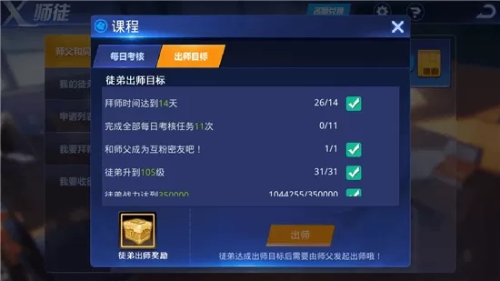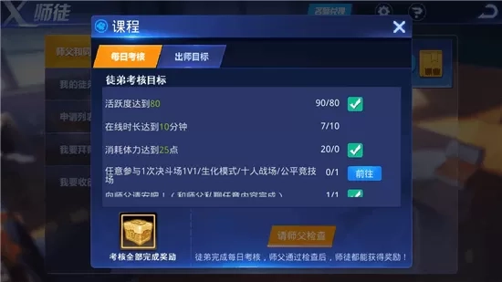 玩家成功拜师后,可点击师傅信息界面的课业按钮,参与每日考核。完成考核后,需请师傅检查,通过后即可领取每日课业奖励。需要注意的是,该奖励仅限未出师的玩家领取,一旦玩家出师,将无法再接取每日考核任务。