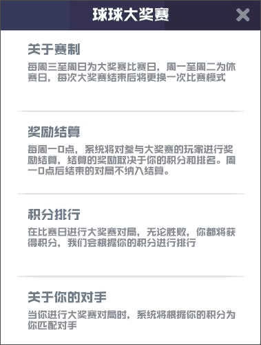 大奖赛以每周为一个周期开展赛事,每周三到周日是比赛日,周一和周二为休赛日。每届大奖赛结束后,都会更换一次比赛模式。球宝们参赛时请留意比赛时间以及当周的比赛模式,可别错过啦~