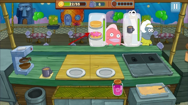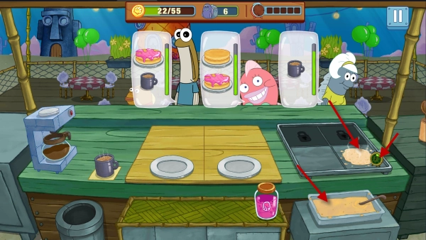 以这个煎饼为例,点击面糊后它会被放入煎锅,等绿色计时器走完就能取出来了。