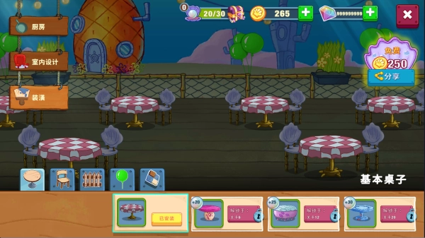 除此之外,点击“装潢”这一栏,我们还能自由布置餐厅。