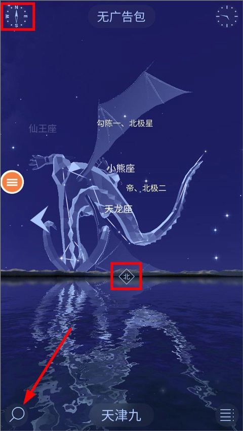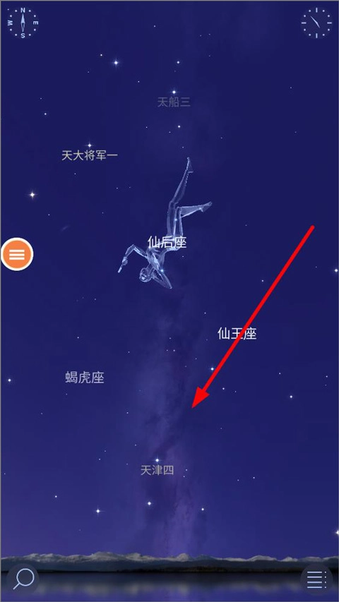 打开星空漫步2,进入主页后会显示当前位置对应的星座,按照提示在左上角找到指南针方向,然后点击左下角的搜索按钮。