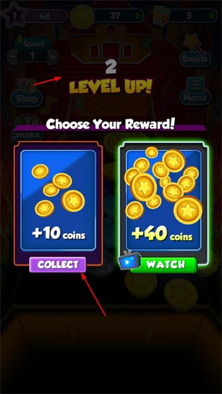 关卡升级后,你可以选择点击COLLECT直接领取少量金币奖励,也可以通过观看视频来获取更多的金币奖励。