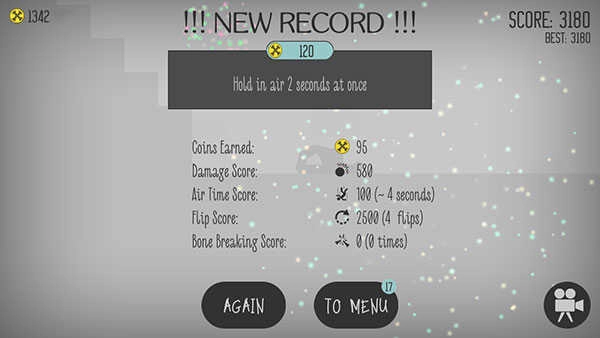 关于BUG,主要出现在那个有三个螺旋桨的地图里:让小人坐在购物车里,蓄力推动购物车前进,当被第一个螺旋桨击中时,小人的肢体会卡在购物篮中,进而不停发生骨折。不过这个BUG不太稳定,小人挣扎时可能会翻跟斗把购物车甩飞。我实验了几百次,大概只有十几次能让小人持续挣扎,这种情况下最少能拿到十几万分,运气好的话能突破五十万。另外有时候用卡车之类的载具,也会出现被卡住骨折的情况,或者直接被螺旋桨卡住导致持续骨折,分数高得惊人,但这种状态下无法保存。
