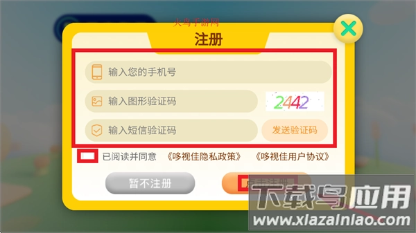 在注册页面依次填写手机号、图形验证码和短信验证码,勾选“已阅读并同意哆视佳隐私政策与用户协议”,点击注册按钮就能完成注册流程。