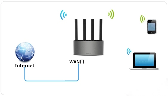 把前端用于上网的宽带线插在路由器的WAN接口上,然后用手机搜索并连接该路由器发出的无线信号。