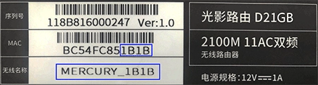 本文以支持多频合一的双频路由器为例,可在路由器底部标贴处查看其出厂时的无线信号名称,通常格式为MERCURY_XXXX(其中XXXX代表路由器底部标贴MAC地址的后四位),具体示例见下图: