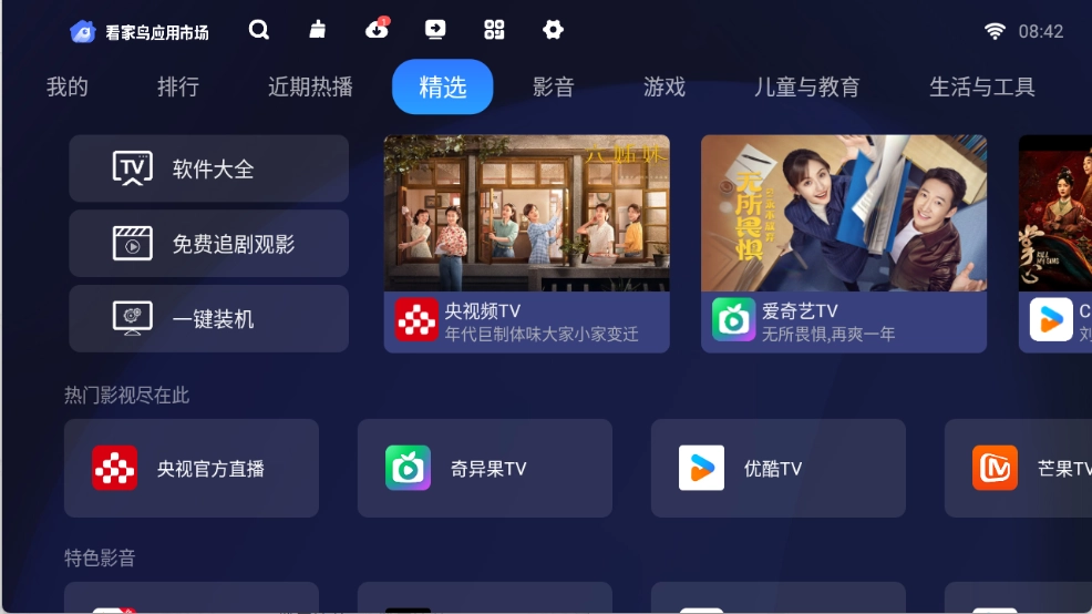 看家鸟市场是专为电视端打造的应用商店,涵盖影视、游戏、音乐等丰富应用类型。平台内每款应用均配备详细截图与功能介绍,助力用户快速了解软件特性;同时设有清晰分类与排行榜板块,且适配多种电视机型号,为用户提供便捷的应用查找与使用体验。