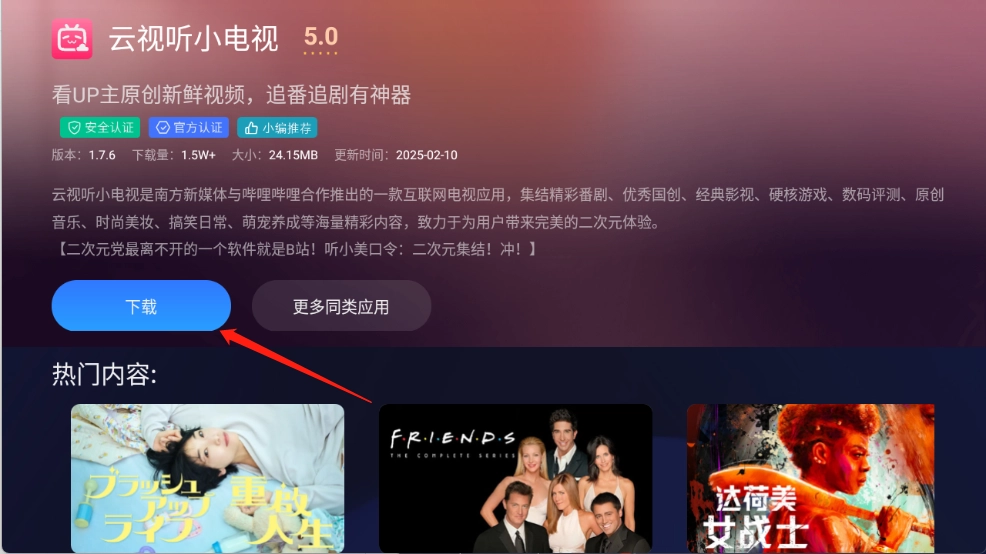 用户找到所需的电视软件资源并点击进入详情页后,能看到详细介绍和耳机图标,直接点击相应按钮,等待安装完成就可以了。