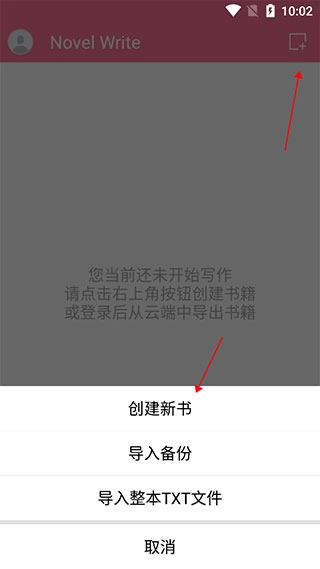 进入【Novel Write】的首页后,点击页面右上角的按钮,即可展开创作选项菜单。