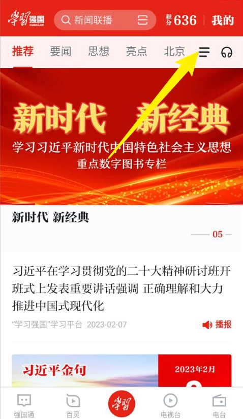 进入首页后,能浏览推荐新闻、要闻、思想、亮点等板块内容,点击菜单图标可查看更多学习频道。