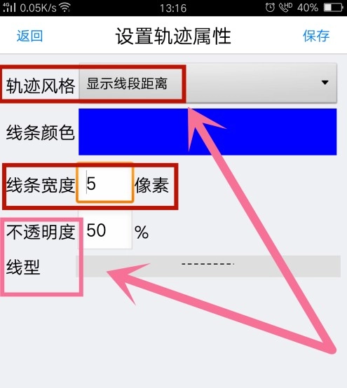 在轨迹属性设置界面,能够对轨迹的样式、颜色、线条粗细等参数进行调整,完成设置后点击保存按钮即可,具体操作可参考图示。