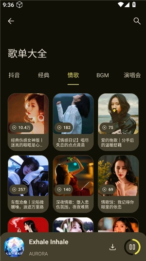 还有抖音、经典、情歌、演唱会等不同类型的歌单可供选择
