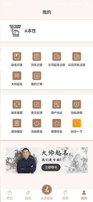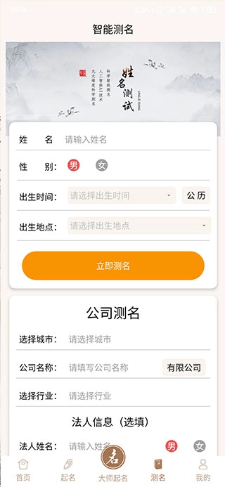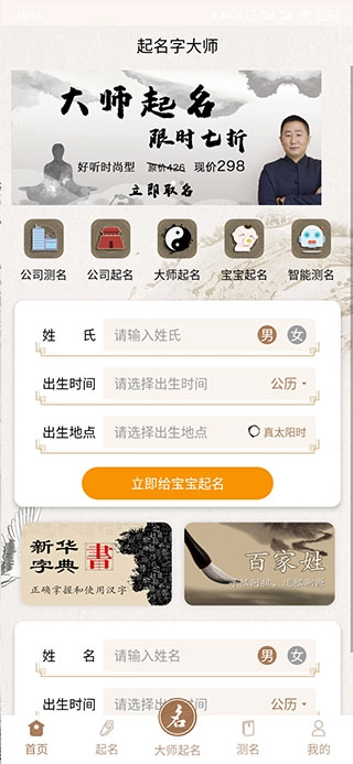然后就会看到首页、起名、大师起名、测名、我的五个版块,在首页中有着公司测名、公司起名、大师起名、宝宝起名、智能测名等功能。