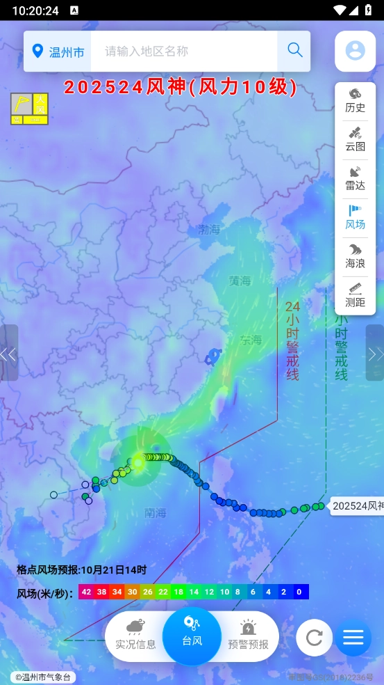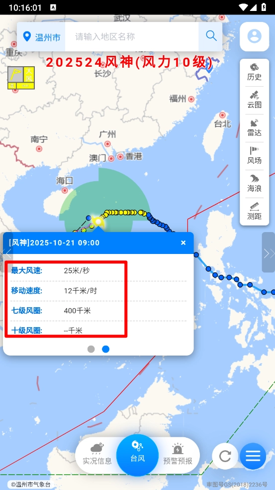 启动应用后,轻点“实时台风”模块,就能直观查看台风的行进轨迹,了解它的移动速度和方向。