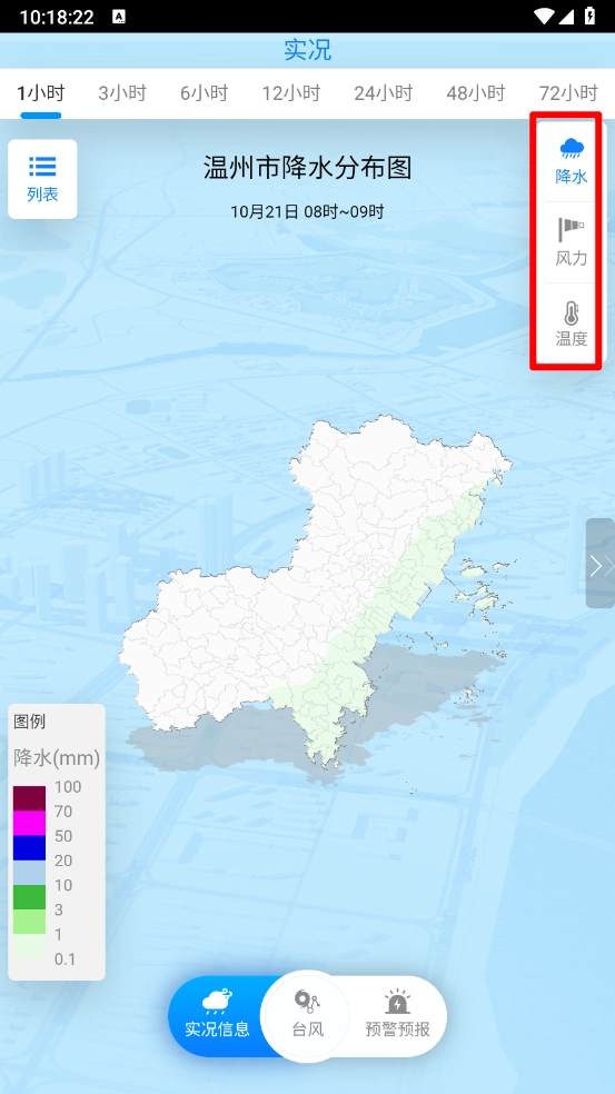 切换到“实况信息”页面,就能查看气温、降水、风力等信息。