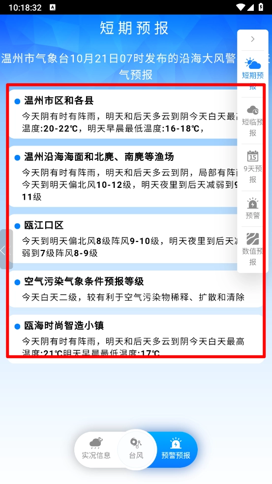 最后用户还能在“预警预报”页面查看每日发布的警报信息与天气预报。