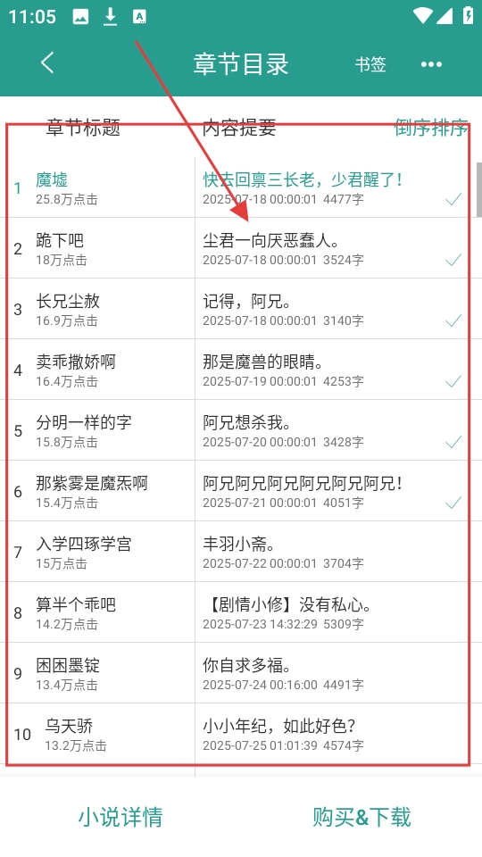 打开章节目录页面后,就能看到各个章节的标题和对应的内容提要,这样就可以挑选自己想阅读的章节来阅读了。