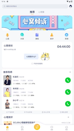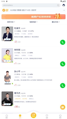 打开软件后,进入首页就能看到许多心理老师。要是你有任何问题,都可以选择一位你觉得合适的心理咨询师进行咨询。