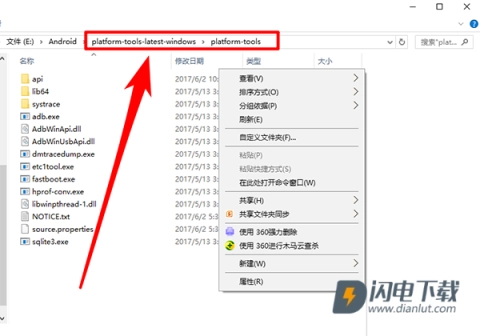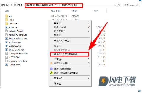 找到ADB文件所在的目录,按住Shift键后点击鼠标右键;
