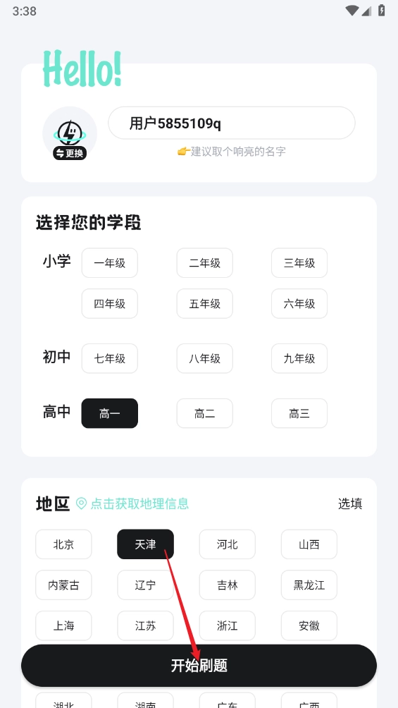 然后选择所学段,点击"开始刷题"。