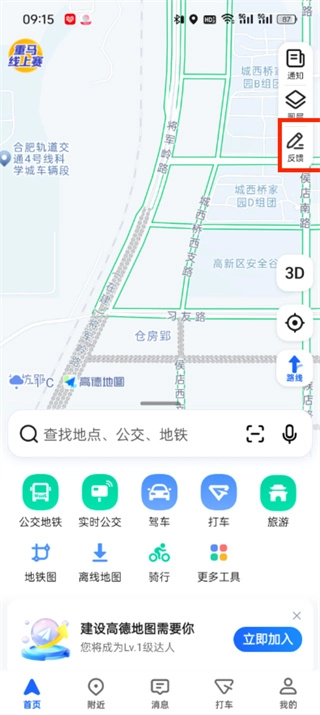 首先打开高德地图应用,进入应用首页后,点击页面右上方的【反馈】按钮。