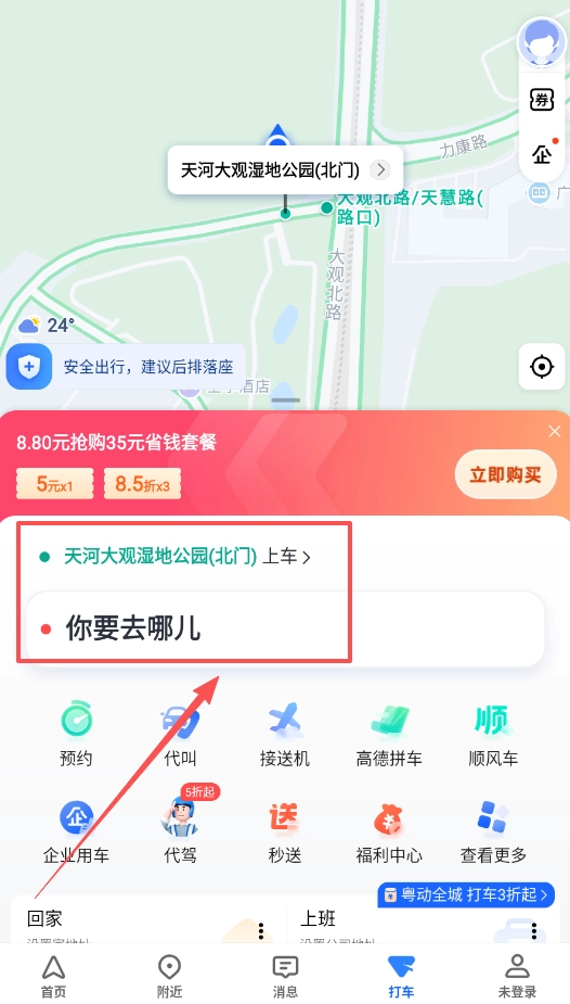 在高德地图主页面点击汽车图标,进入叫车页面;