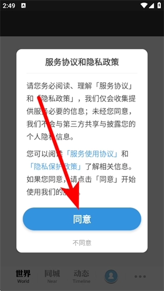 打开每日环球展览应用,当出现服务协议与隐私政策的弹窗时,点击“同意”按钮。