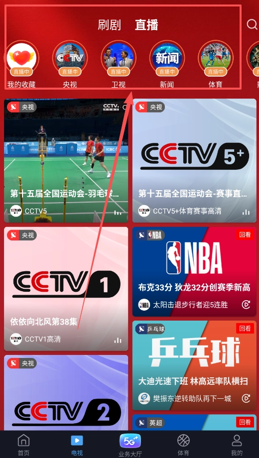 若您想观看直播内容,可进入“电视”板块并选择“直播”选项,这里汇聚了央视、卫视、体育等多个频道的实时节目。
