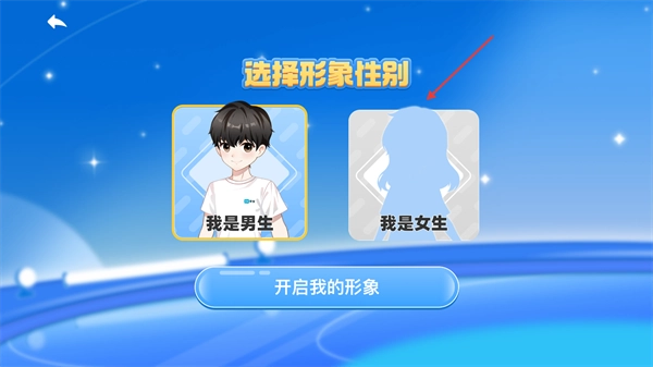 请从“我是男生”和“我是女生”中选择一项,接着点击【开启我的形象】按钮,以此来确定形象的性别。