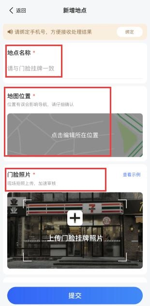 在新增地点的功能里,对地点名称、地图位置、门脸照片等相关信息进行编辑。
