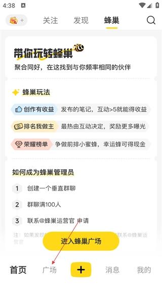 在首页中,点击【广场】按钮,进入广场页面。