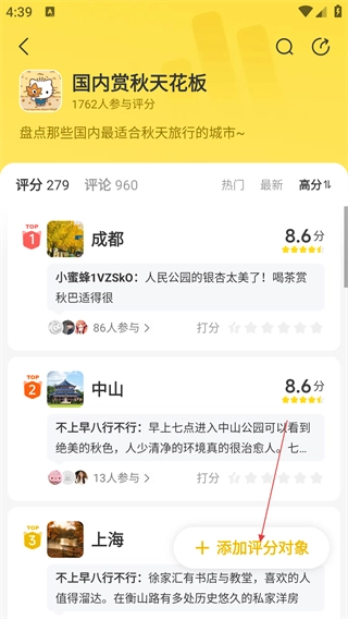 在榜单详情页面,点击【+添加评分对象】按钮,即可进入添加评分对象的页面。