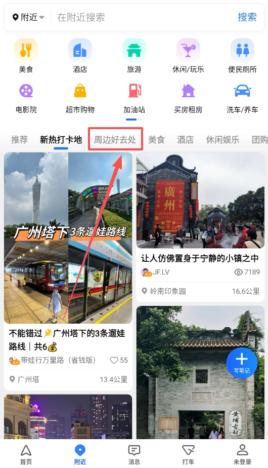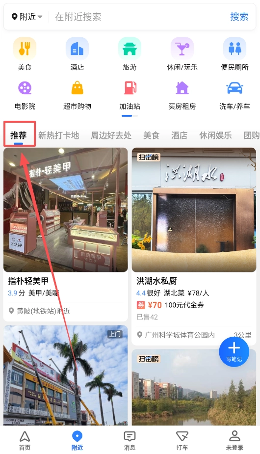 查找周边服务时,进入附近页面,像电影院、加油站这类各类生活需求都集中在这里,直接选择所需的类别,就能快速找到目标。